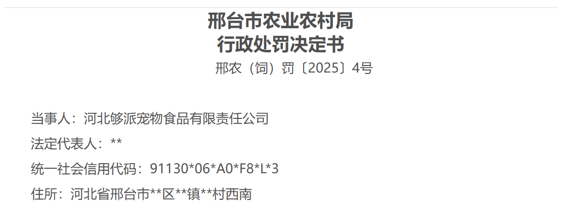 白皮书团队讯,近日,河北够派宠物食品有限责任公司因生产的宠物饲料未按规定进行质量检验,被邢台市农业农村局处以1.5万元罚款。这起看似普通的行政处罚案件,却因涉及“添加冻干后是否需重新检验”这一行业常见操作,引发行业关注。