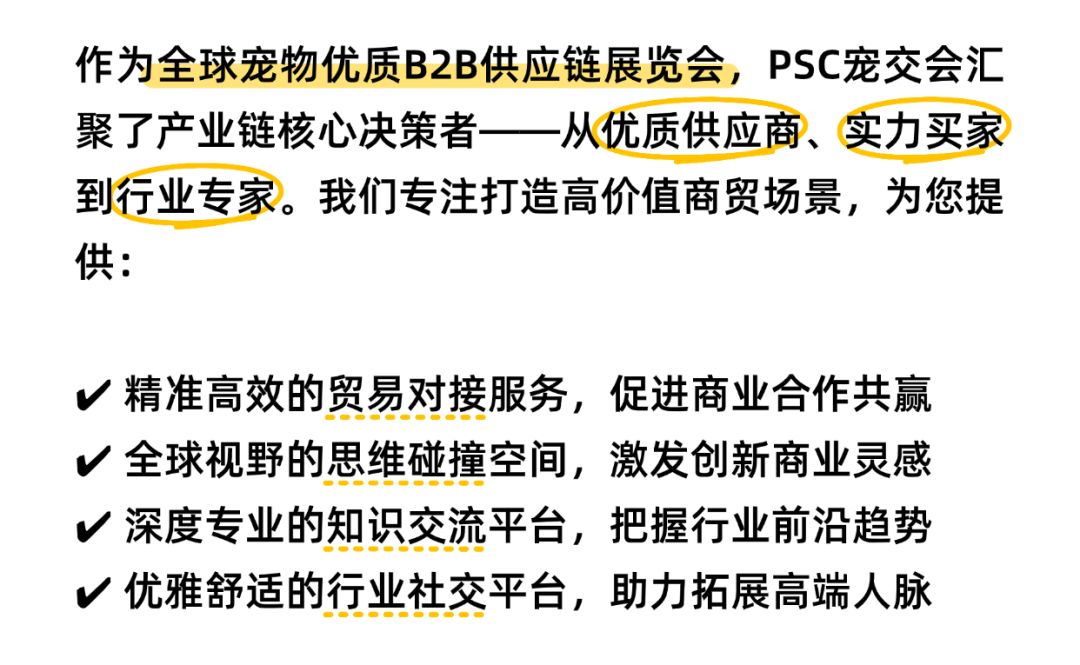 白皮书团队讯,作为传统贸易展会的升级版,PSC 宠交会以 “让全球宠物商业合作更简单” 为理念,聚焦中国宠物产业的全球竞争力。
