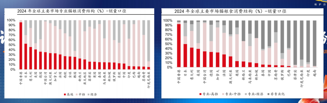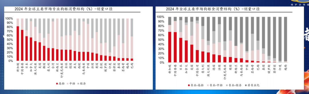 新加坡、香港等地高端粮占比虽比猫粮略少,但仍很高,几乎没有经济粮,其余全是中端粮;