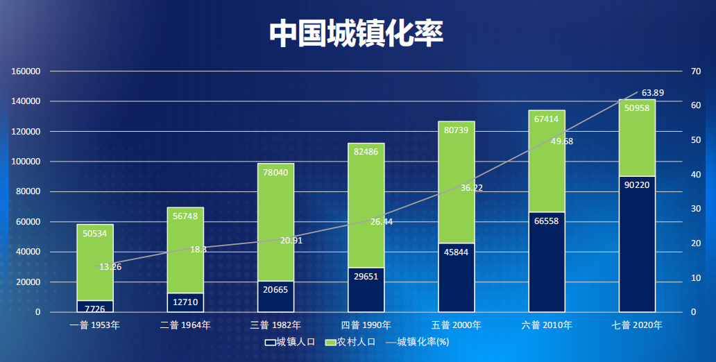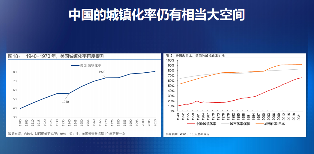 与美、日相比,我国的城镇化水平仅相当于两国上世纪七八十年代,从趋势上看,中国的城镇化率越来越高,城镇人口数量正在不可逆转地快速提升。