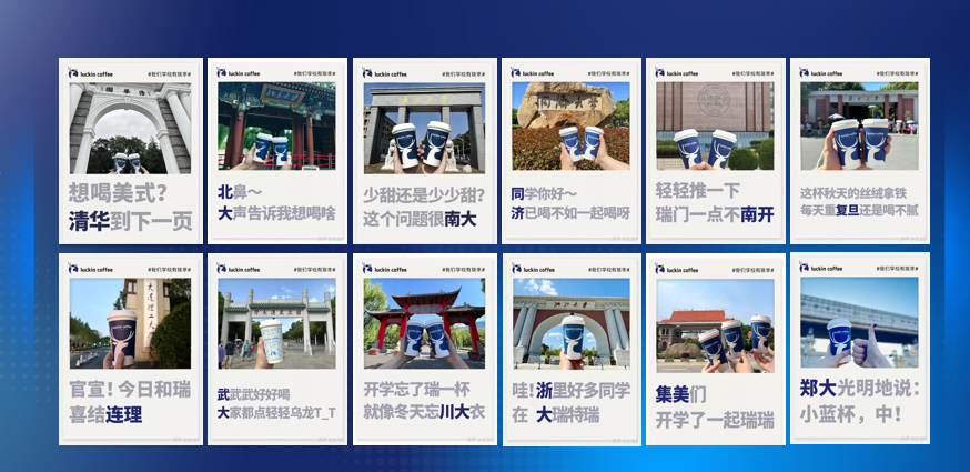 瑞幸的“我们学校有瑞幸”活动,用各校谐音梗,如清华大学“想喝美式,清华到下一页”、北京大学“北鼻,大声告诉我想喝啥”、南京大学“少甜还是少少甜,这个问题很南大”。它借此真正下沉至各校,让未来潜在白领、咖啡消费者,在上学时首杯咖啡即接触瑞幸,他们未来的选择不言而喻。
