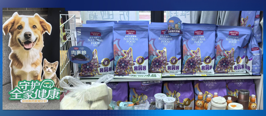 西安众信药店门口悬挂“爱宠计划”海报,路人皆以为仅售驱虫药,店内实际陈列麦富迪主粮,这足以显示品牌已将触角伸至社区药房。