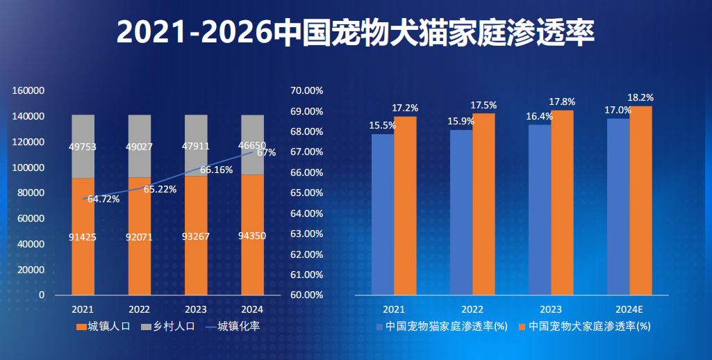 2021年至2026年中国家庭养犬、养猫的渗透率均在逐步上升,这意味着养猫养狗的家庭越来越多了。