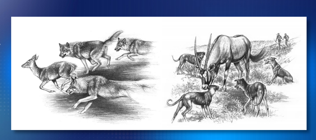 狼群在追逐猎物,人类发现了它们的特性,开始驯养狼群,将其转变为猎狗。