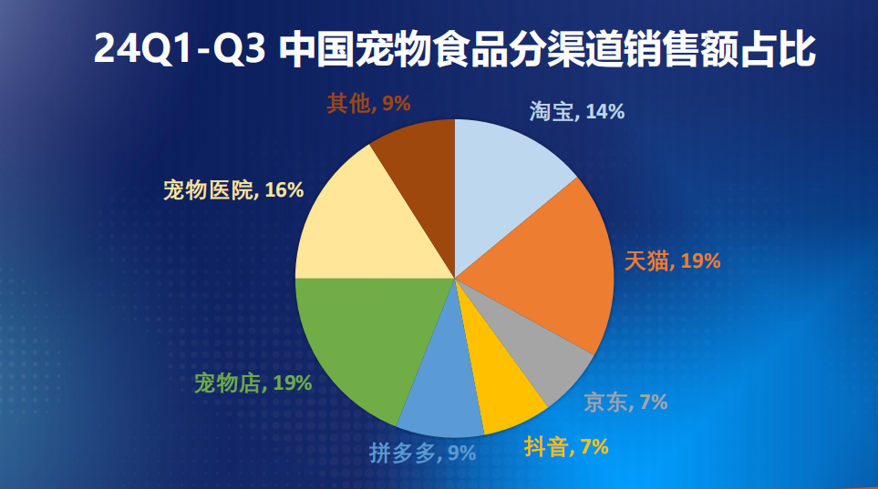 2024年Q1至Q3中国宠物市场分渠道销售额占比中,拼多多、抖音等平台正在逐步抢占市场份额,且增速良好。