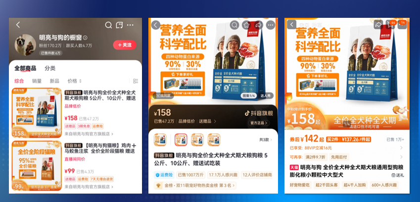 “明亮与狗”通过抖音、拼多多聚焦下沉市场,主要面向大型犬宠主。