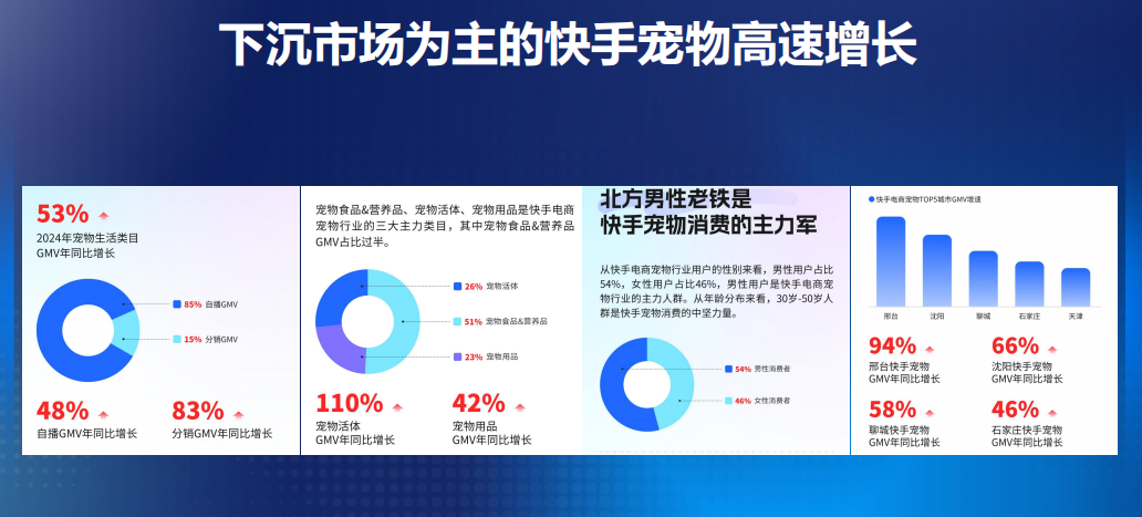 快手2024年宠物生活类目GMV同比增长53%,远超宠物行业大盘增速(约百分之十几)。