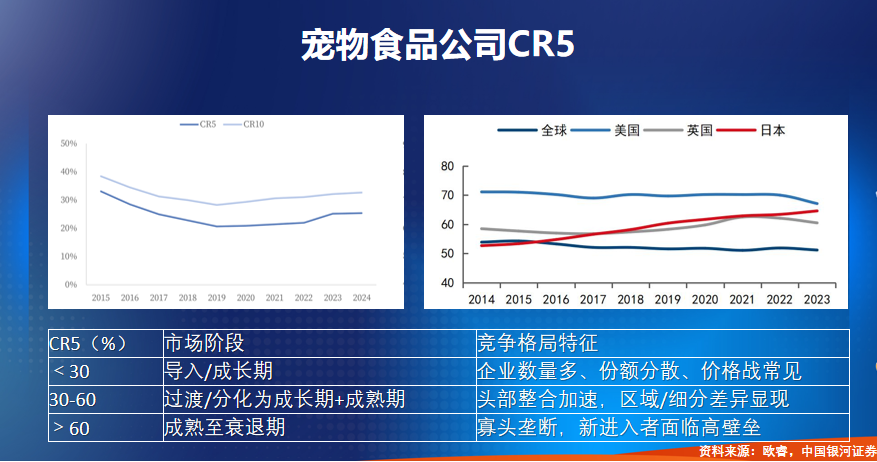 市场集中度指标CR5(前五企业市占率)显示,中国宠物食品市场仍处高度分散阶段,占比不足30%,而成熟市场如美国、英国、日本,CR5普遍超50%,甚至达70%以上。这意味着中国宠物行业未来必将走向集中。