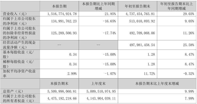 宠物食品巨头乖宝宠物在三季度实现营业总收入47.37亿元,同比增长29.03%,归母净利润5.13亿元,同比增长9.05%。尽管第三季度单季归母净利润出现下滑,同比减少16.65%,但这主要是与公司持续加大品牌及渠道投入有关。此外,随着泰国工厂及国内部分产线陆续转固,固定资产较年初增长38.51%,折旧成本相应提升,也对短期利润形成一定压力。从经营性现金流量净额同比增长25.58%来看,乖宝的主营业务现金流状况良好,短期投入或将为长期发展积蓄能量。