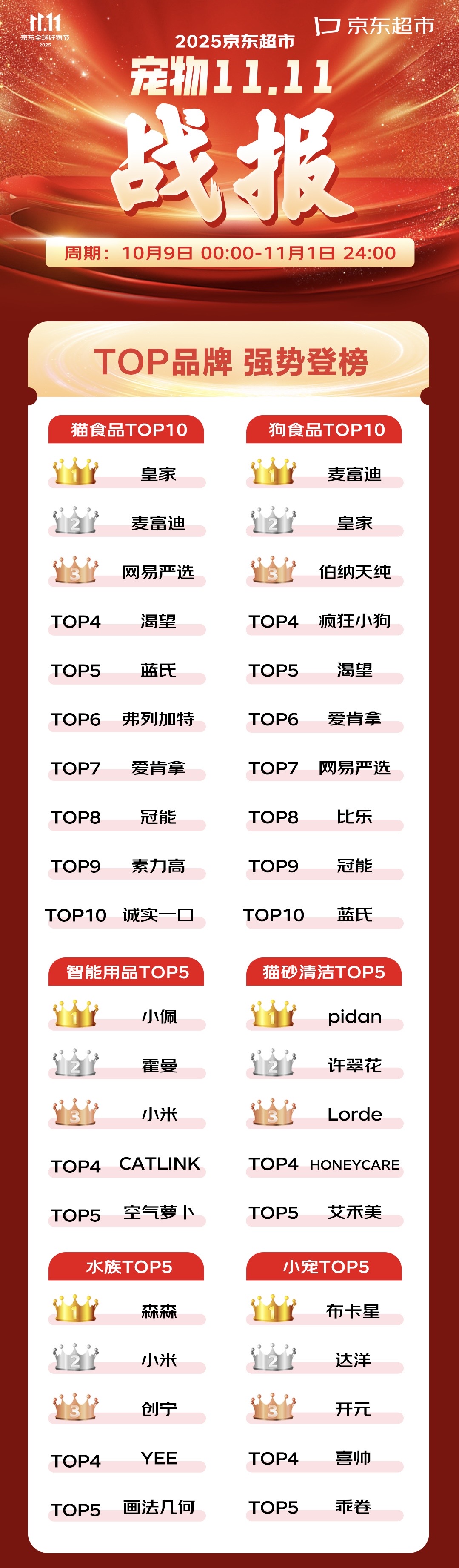 白皮书团队讯,今日,京东正式发布了其宠物板块双十一首份战报(统计时间周期为10月9日 00:00-11月1日 24:00)。为了从这份销售数据中提炼出对品牌商与行业从业者至关重要的消费趋势与增长机会,白皮书团队特别整理了本次战报的相关内容,以供大家参考,以下为战报详情: