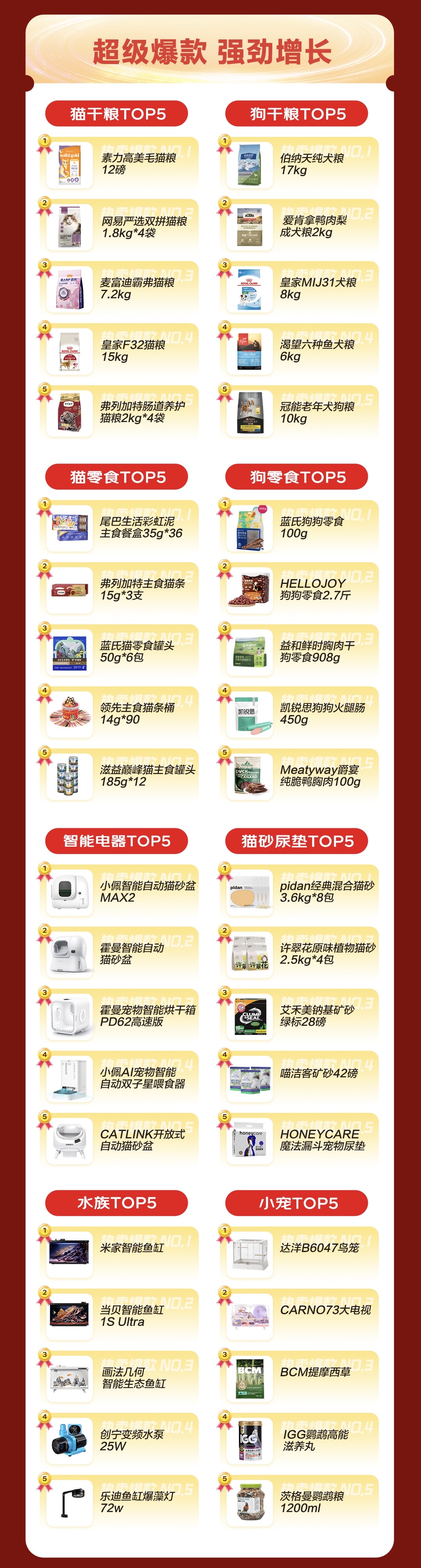 闭眼买的宠物金选宠粮迎爆发:领先羊奶鸡烘焙猫粮1.5kg*4成交额同比535%;伯纳天纯蔓越莓味犬粮17kg成交额同比127%;皇家F32猫粮4.5kg成交额同比100%。