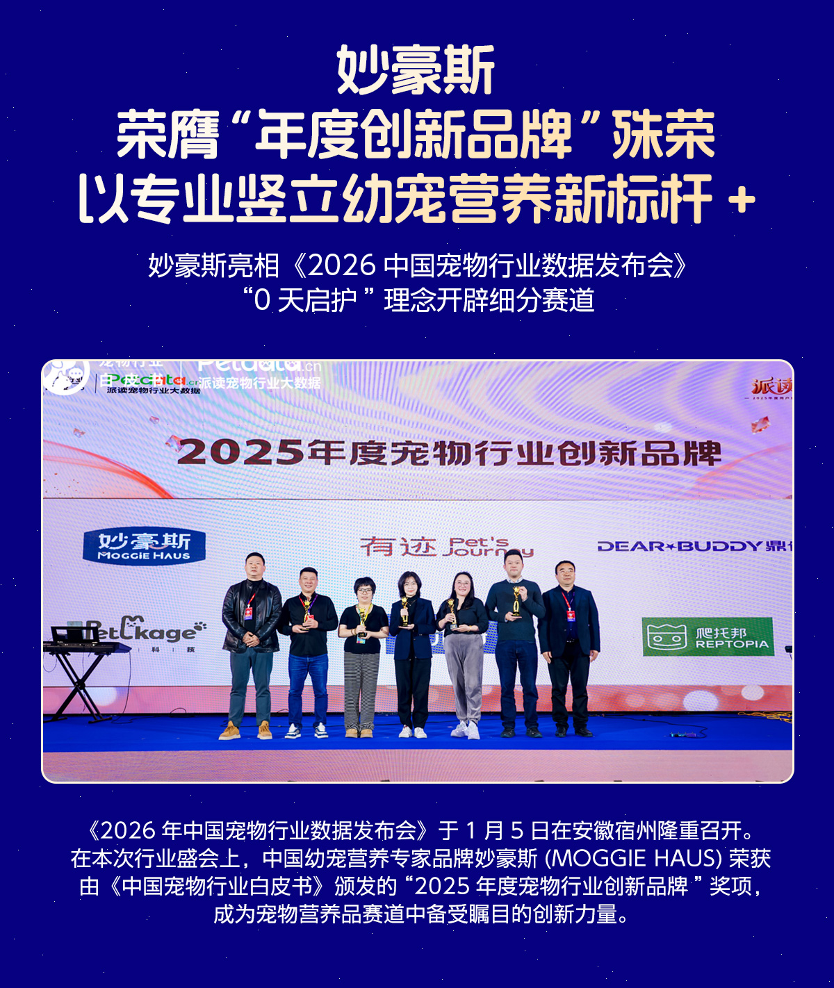 白皮书团队讯,2026年中国宠物行业数据发布会于1月5日在安徽宿州隆重召开。在本次行业盛会上,中国幼宠营养专家品牌妙豪斯(MOGGIE HAUS)荣获由《中国宠物行业白皮书》颁发的“2025年度宠物行业创新品牌”奖项。