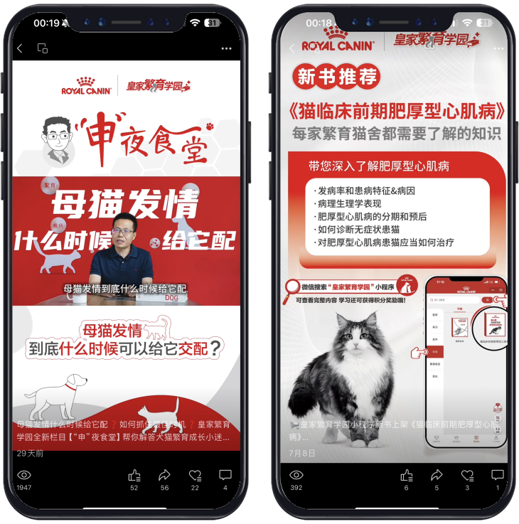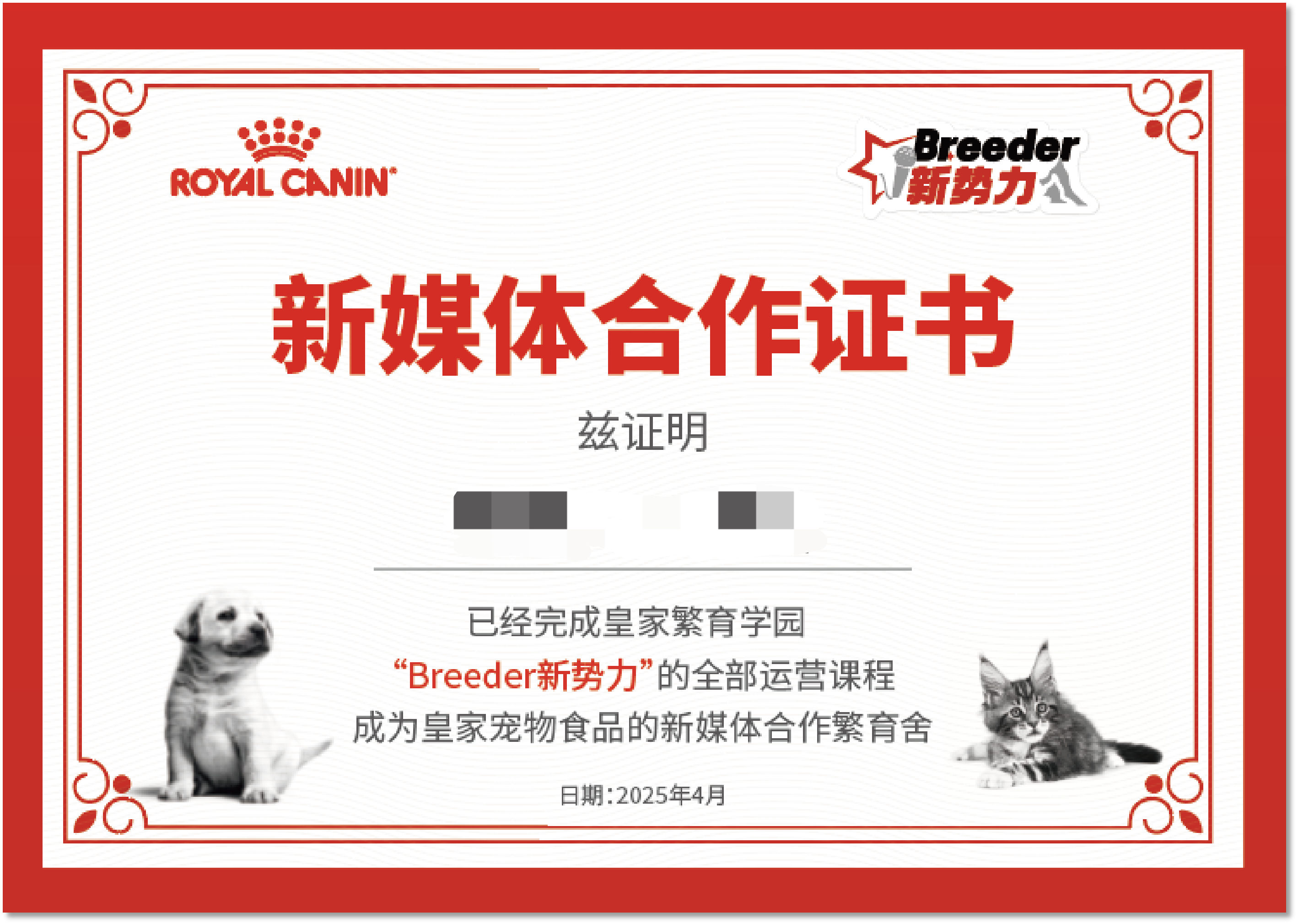近年来,伴随数字化浪潮,皇家对于繁育行业的赋能路径也在不断拓宽:从线下延伸至线上,从知识科普走向内容共创,携手繁育人以创新形式探索行业健康发展的新可能。作为繁育人一站式服务平台,“皇家繁育学园”通过定制化多维课程、“申夜食堂”线上短科普等形式,帮助繁育人深度学习科学繁育知识。与此同时,品牌洞察到,约70%的繁育人有运营犬猫舍社媒账号。在这一新趋势下,皇家通过“Breeder新势力”繁育人新媒体赋能项目等一系列新媒体定制化服务,助力繁育人扩大社媒影响力,让专业的声音被更多人听见。