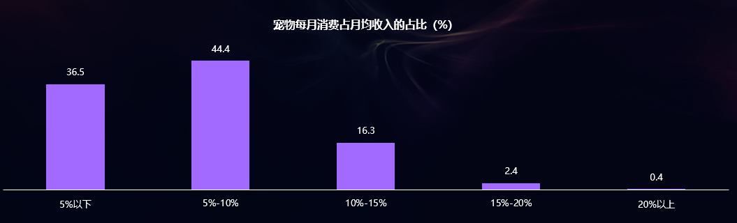 此外,16.3%的宠主每月养宠消费占月均消费的10%~15%,2.4%的宠主每月养宠消费占月均消费的15%~20%。