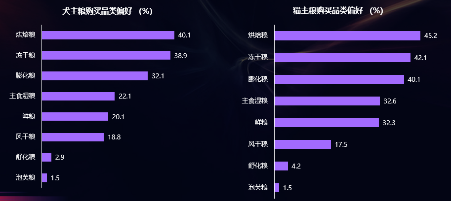烘焙粮、冻干粮是犬主人、猫主人主要购买的主粮品类,其次是膨化粮、主食湿粮。