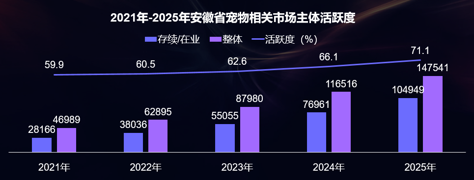 2025年,安徽省宠物相关存续/在业市场主体数量为104949家,相较于2024年增加27988家。从市场主体活跃度来看,存续/在业市场主体占整体注册市场主体的71.1%,宠物企业存续/在业比例逐年增长,活跃度呈现良好增长态势。