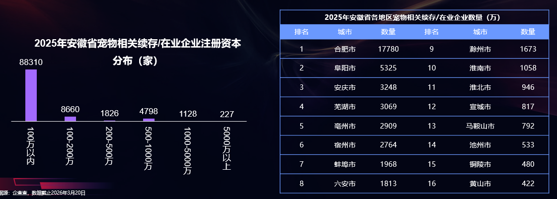 宠物企业注册资本百万以内为主,合肥阜阳安庆位列前三