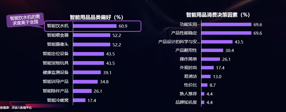 在购买智能用品时,功能实用性、产品性能稳定是宠主关注的主要决策因素,占比均为69.6%。其次是产品设计的科学与安全、产品耐用性、操作简单,占比分别为43.5%、30.4%、26.1%。