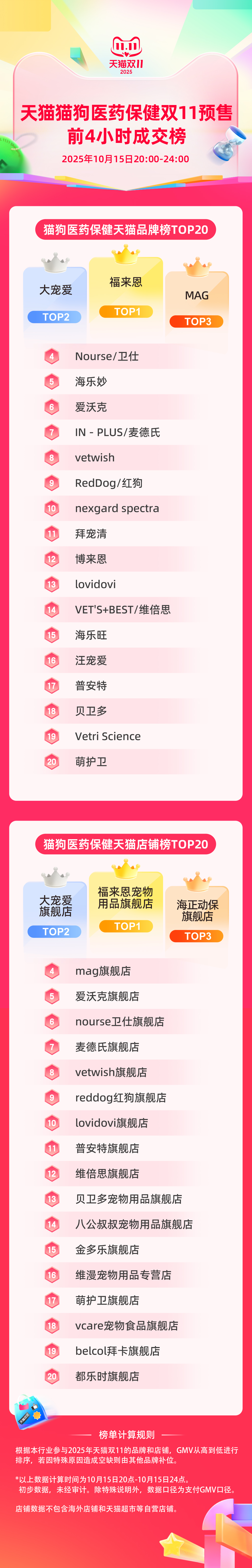 猫狗医药保健天猫店铺榜TOP10:福来恩宠物用品旗舰店、大宠爱旗舰店、海正动保旗舰店、mag旗舰店、爱沃克旗舰店、nourse卫仕旗舰店、麦德氏旗舰店、vetwish旗舰店、reddog红狗旗舰店、lovidovi旗舰店。