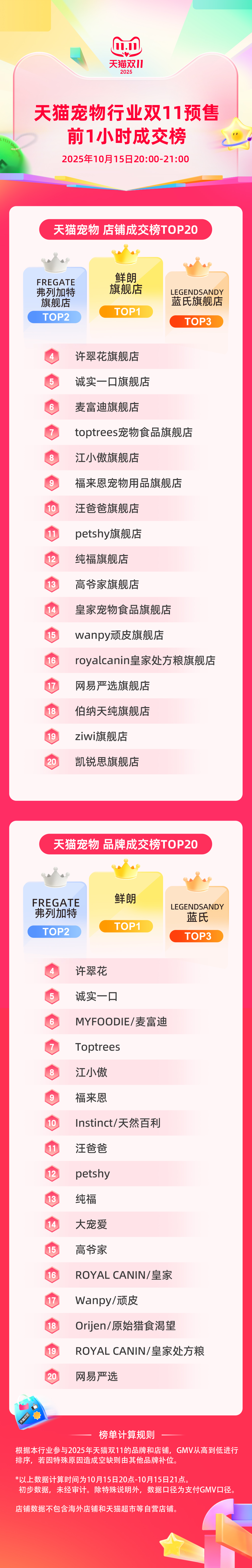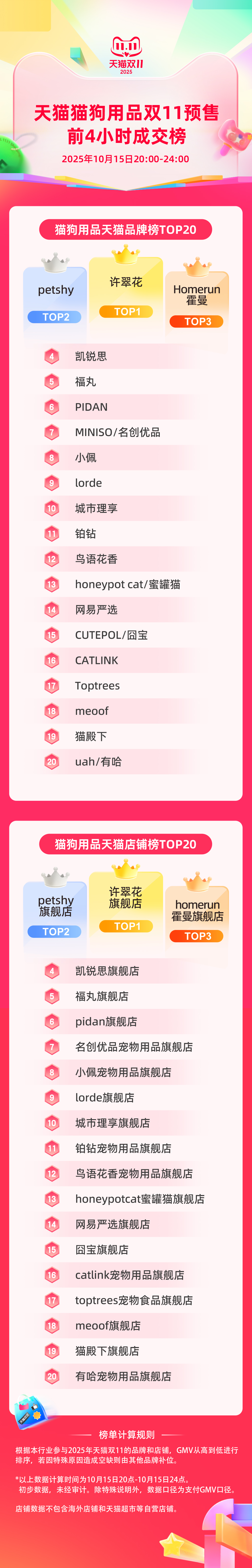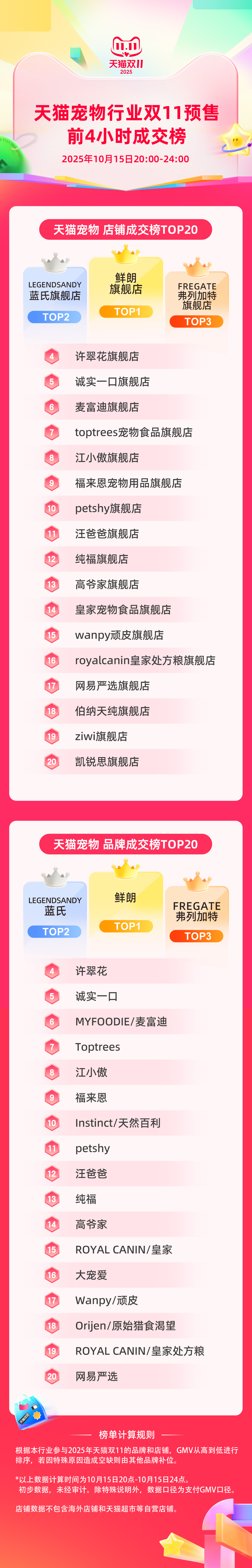 白皮书团队讯,今日,淘宝天猫正式发布了双十一预售前1小时和前4小时的宠物板块成交榜单,统计时间分别为2025年10月15日20:00-21:00和2025年10月15日20:00-24:00。作为消费市场的“晴雨表”,两大平台预售首日的战绩尤为引人注目。