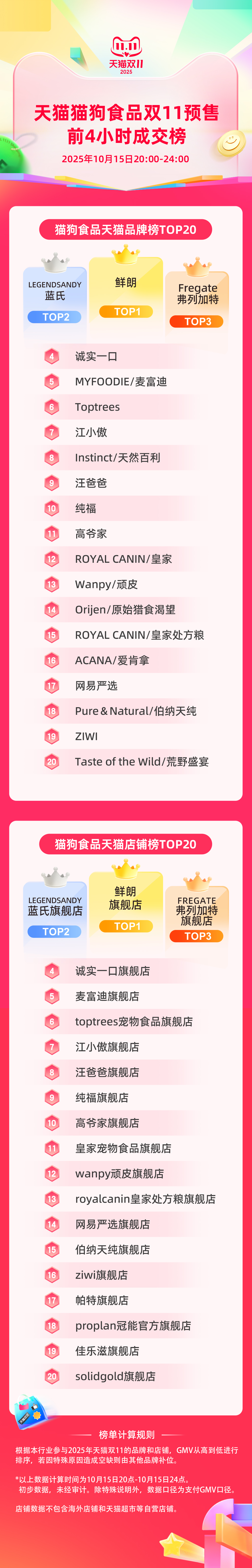 天猫宠物店铺、品牌成交榜:鲜朗夺双冠