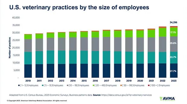 根据美国兽医协会经济学家Frederic B. Ouedraogo提供的2025年动物医院所有者调查的数据,自2019年以来,每家动物医院的活跃客户平均数量每年减少约95位,到2024年总计为3351位。在同一时期,每位全职兽医的活跃客户平均数量每年减少15位,到2024年总计为1499位。这一双降趋势,不仅反映出美国动物医院的客户基础的收缩,也暗示了兽医人力资源配置与市场需求之间可能存在的错配。