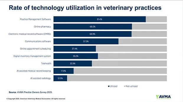 技术应用的深度与广度也成为影响医院效能的关键变量。调查显示,尽管技术在优化流程、提升生产力方面潜力巨大,但其在动物医院中的实际应用率仍待提高。从每名兽医每日接诊数量来看,2024年平均为15例,较2021年的16.6例有所下降。Ouedraogo分析,2021年的数据或因疫情期间需求积压而偏高,但后续回落也可能反映出市场需求的结构性变化。Ouedraogo表示,如果市场整体需求放缓,那么无论医院内部效率多高,接诊量都难以提升。因此,医院需要在提升内部运营效率的同时,密切关注外部市场动态。