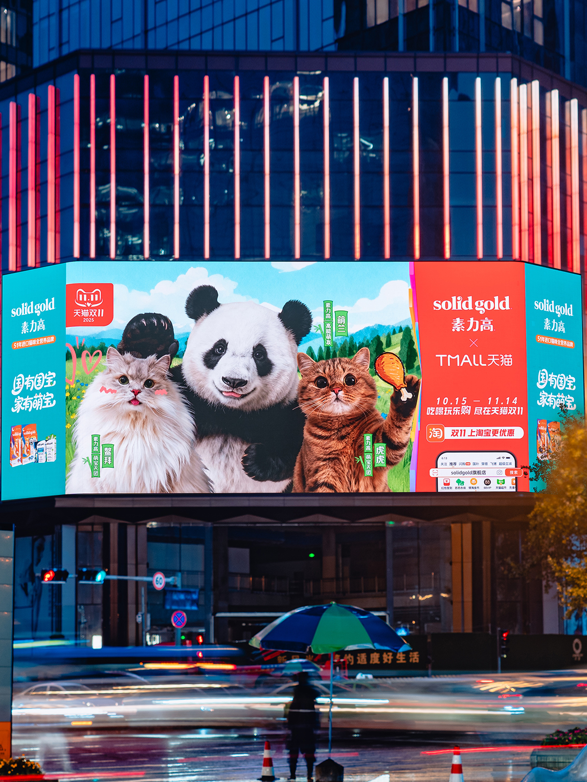 而在活动延续期,四城大屏的投放则为整个传播活动画上圆满句号,将线上的互动热度,成功转化为线下实体场景的集中展示,为优质用户内容提供了极具仪式感的展示平台。在线下,活动于北京、上海、广州、成都四城核心商圈同步点亮联名主题大屏,获得点赞最高的素人“萌猫”将携手熊猫萌兰一同登上北京、上海、广州、成都四城的地标户外大屏,不仅实现了流量的集中兑现,更通过场景化的品牌曝光,强化了活动声势,提升了品牌的整体格调。