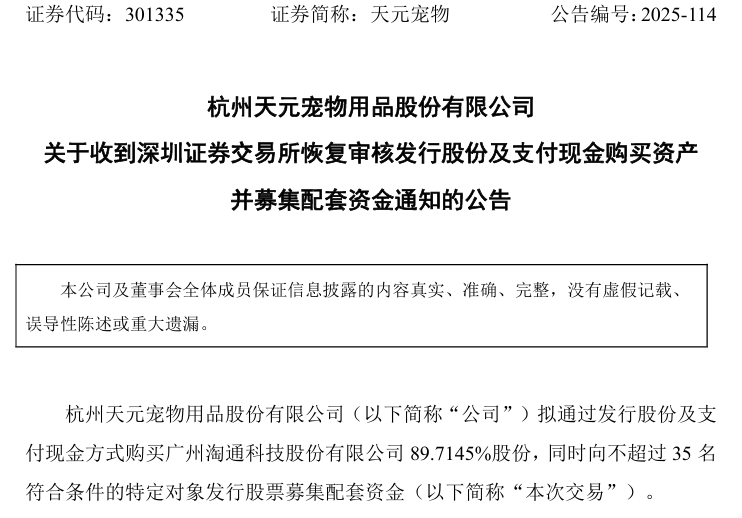 回溯本次收购计划的推进历程,杭州天元宠物用品股份有限公司(以下简称“天元宠物”)拟通过发行股份及支付现金的方式购买广州淘通科技股份有限公司(以下简称“淘通科技”)89.7145%股权并募集配套资金。然而在2025年9月30日,天元宠物收到深圳证券交易所(以下简称“深交所”)的通知,因重组申请文件中审计报告财务数据基准日为2024年12月31日,已过有效期,需要补充提交,按照《深圳证券交易所上市公司重大资产重组审核规则》的相关规定,深交所对天元宠物本次重组中止审核。如今,随着补充材料的提交与审核恢复,这场备受瞩目的跨界收购再度进入公众视野。