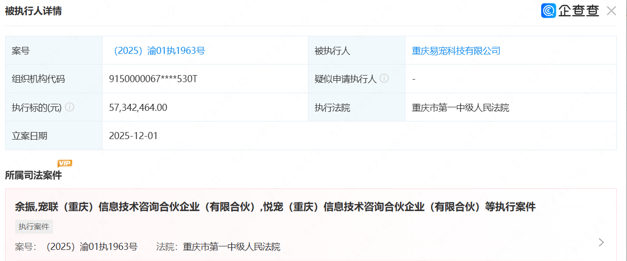 白皮书团队讯,近日,重庆易宠科技有限公司(以下简称“易宠”)新增一则重磅被执行信息,执行金额高达5734万元,创始团队肖宇、余振、王刚及三家关联企业同步被列入被执行名单,这一消息在宠物行业引发广泛关注。作为曾被视为宠物行业垂类电商标杆平台的易宠,此番境遇不仅暴露了自身经营困境,更折射出国内宠物赛道垂类电商普遍面临的发展难题。