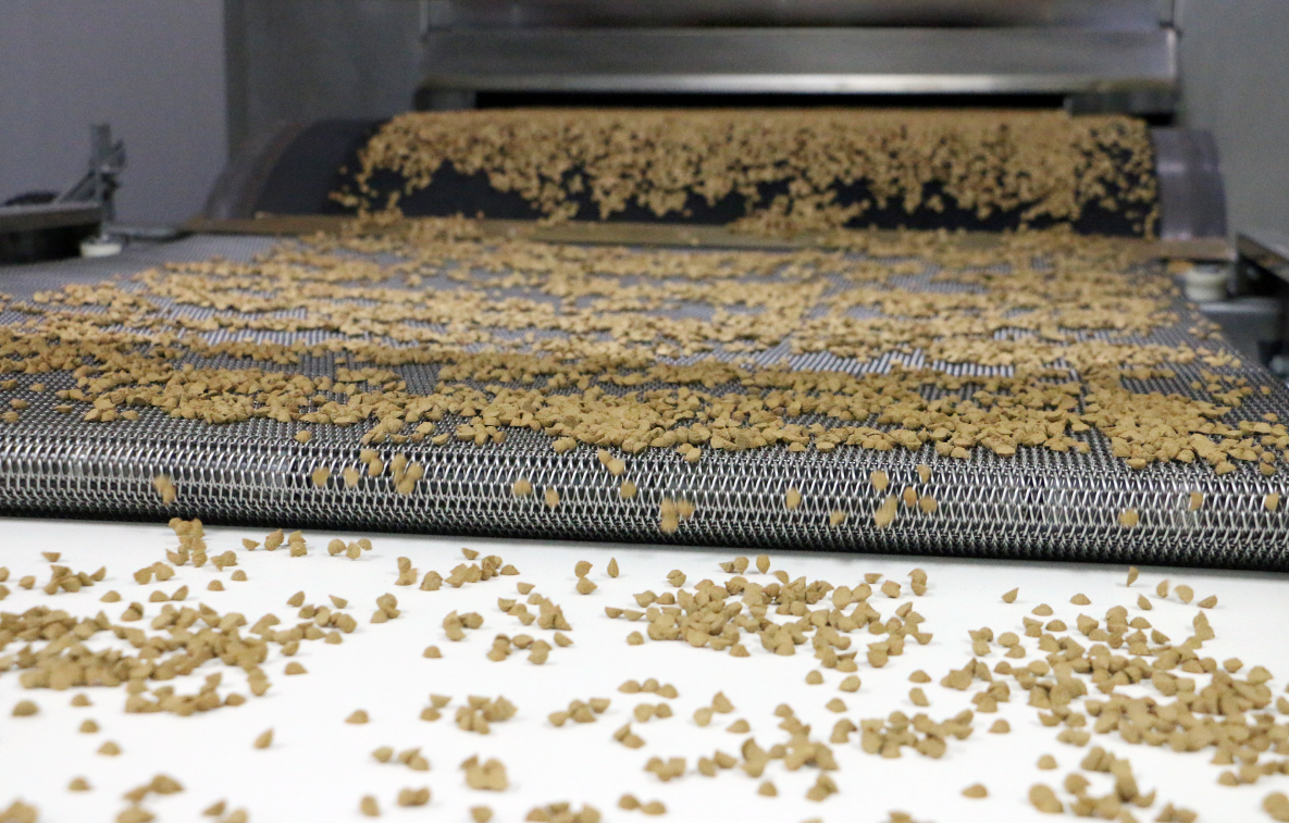 与普遍采用高温高压挤压成型的膨化粮不同,深酥焙的工艺更像一场精心控制的“炙烤艺术”。其核心在于210℃、180℃、140℃ 三个精确温阶的递进与协同:第一段210℃的瞬时烈焰灼烤,目的明确——高效灭菌,从源头建立安全屏障;随后温度降至180℃进入慢烘慢焙阶段,旨在温和脱水、锁住肉源本身的天然风味与热敏营养素,避免高温长时间处理带来的营养损耗;最后阶段140℃的轻烘,则专为塑造颗粒的物理结构服务,赋予其独特的蓬松酥脆质地。