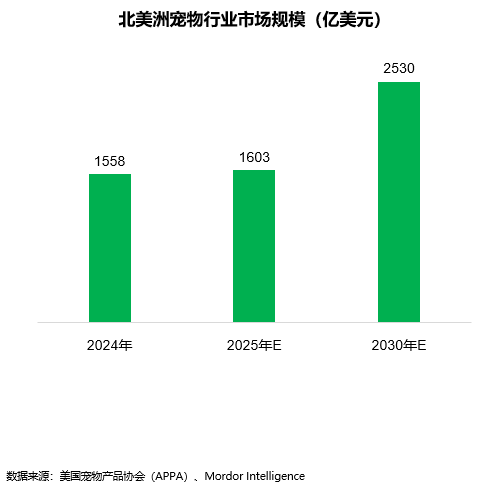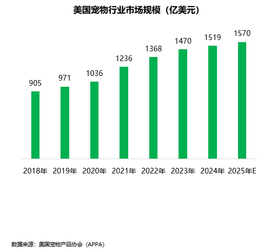 2024年,美国宠物行业市场规模为1519亿美元,2025年市场规模将达到1570亿美元,预计到2030年将攀升至2500亿美元,复合年增长率为 9.80%。