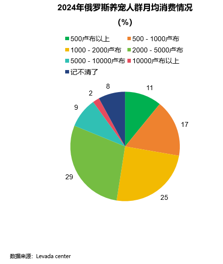 2024年,29%的养宠人月均花费2000-5000卢布,25%月均花费1000-2000卢布。养宠人群平均花费2825卢布。