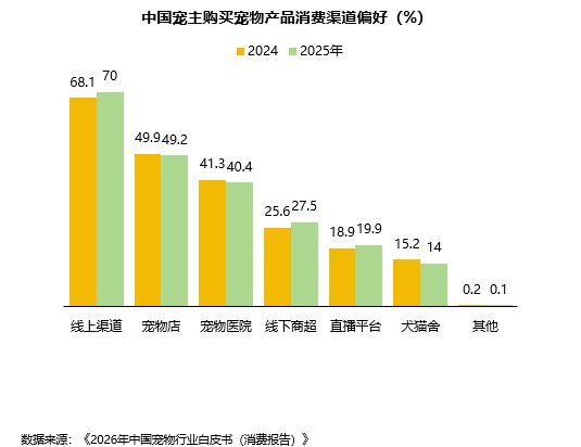 宠主购买宠物产品首选仍是线上渠道,占比为70%。其次是宠物店、宠物医院,占比分别为49.2%、40.4%。线下商超、直播平台使用率相对偏低,占比分别为27.5%、19.9%。与2024年相比,线上渠道、线下商超、直播平台的占比有所上升,宠物店、宠物医院、犬猫舍的占比有所下降。