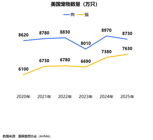 美国宠物数量(狗和猫)为1.636亿只,其中,狗的数量为8730万只,猫的数量为7630万只。