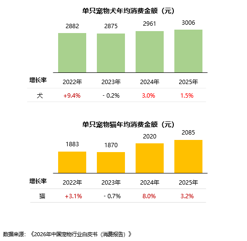 单只犬年均消费3006元,较2024年小幅上升1.5%。单只猫年均消费2085元,较2024年上升3.2%。