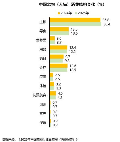 食品仍是宠主的主要消费市场,市场份额为53.7%,较2024年略有上升。其次是医疗,市场份额为27.6%,较2024年有所下降。用品、服务市场份额较低,分别为12.2%、6.5%。从细分结构来看:在食品领域中,主粮、零食、营养品份额较2024年小幅上升。医疗领域中,体检小幅上升,药品、诊疗小幅下降。