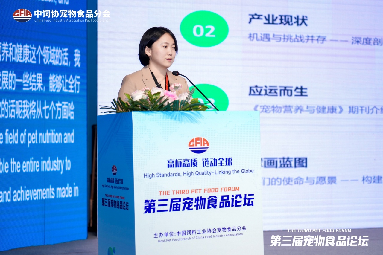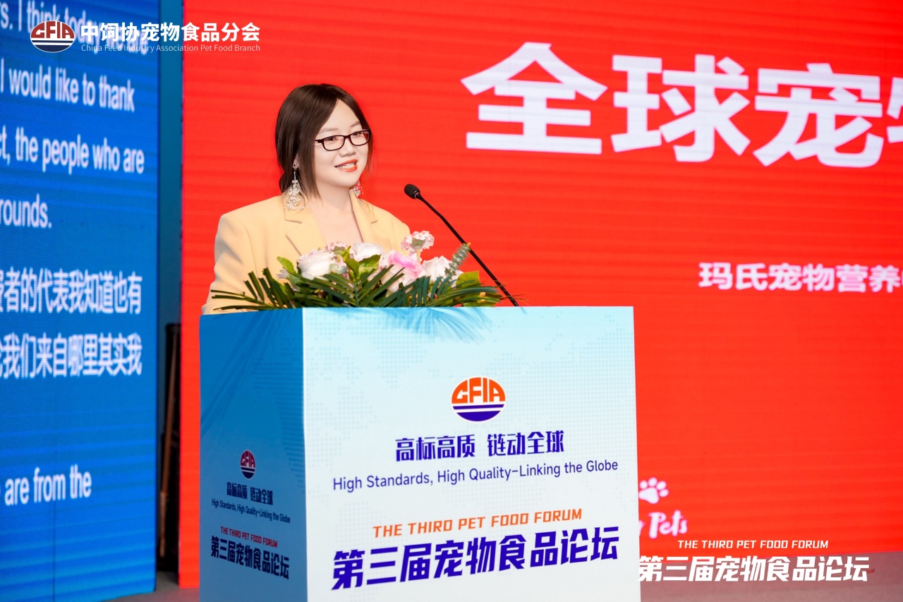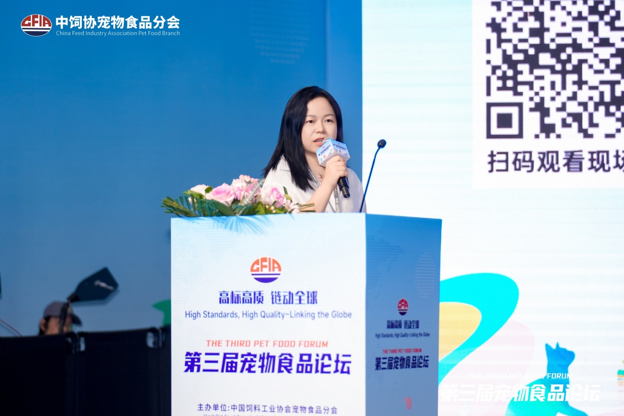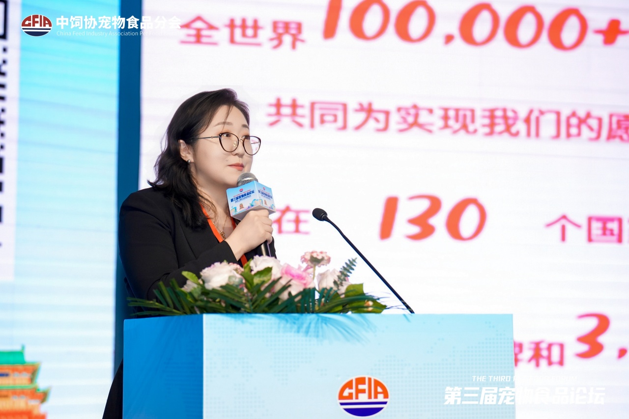 玛氏中国公共事务总监、玛氏宠物营养中国企业事务部负责人鄂婷带来《全球宠物食品市场趋势》主题演讲。她指出全球宠物总量超10亿,Z世代成为养宠主力,宠物行业正朝着功能化、精细化、情感化、宠物友好方向快速升级,她表示企业应深度洞察宠主需求,以科学营养与全周期健康理念驱动行业高质量发展。