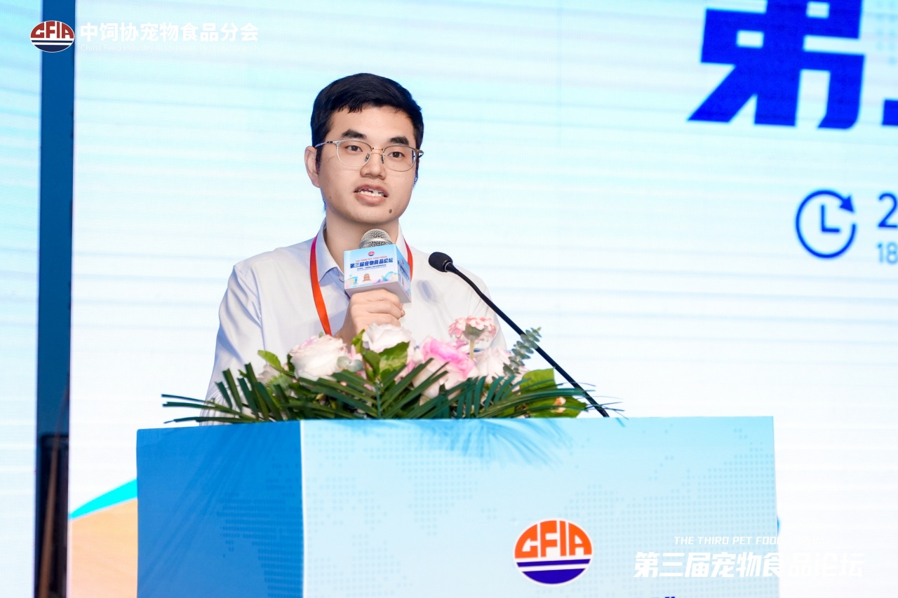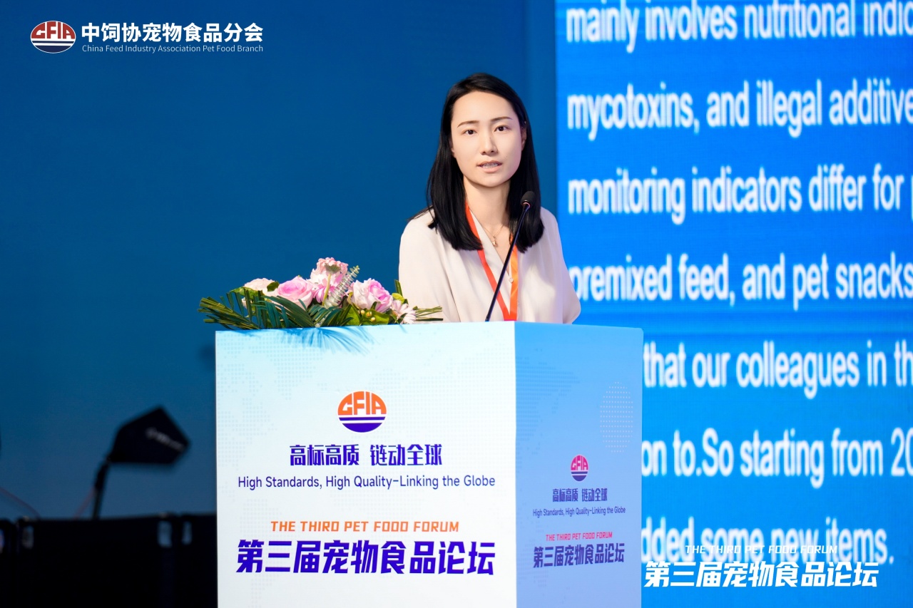 研究员、国家饲料质量检验检测中心(北京)常务副主任樊霞的助手冯玉超带来《宠物食品质量安全现状与风险防控》主题演讲。她介绍了我国宠物食品监管体系、质量安全监测结果与当前行业存在的原料管控、标签不规范、非法添加等突出风险,她表示宠物食品行业需强化全链条质控、完善标准体系并加快快检技术应用,共同守护宠物食品安全底线。
