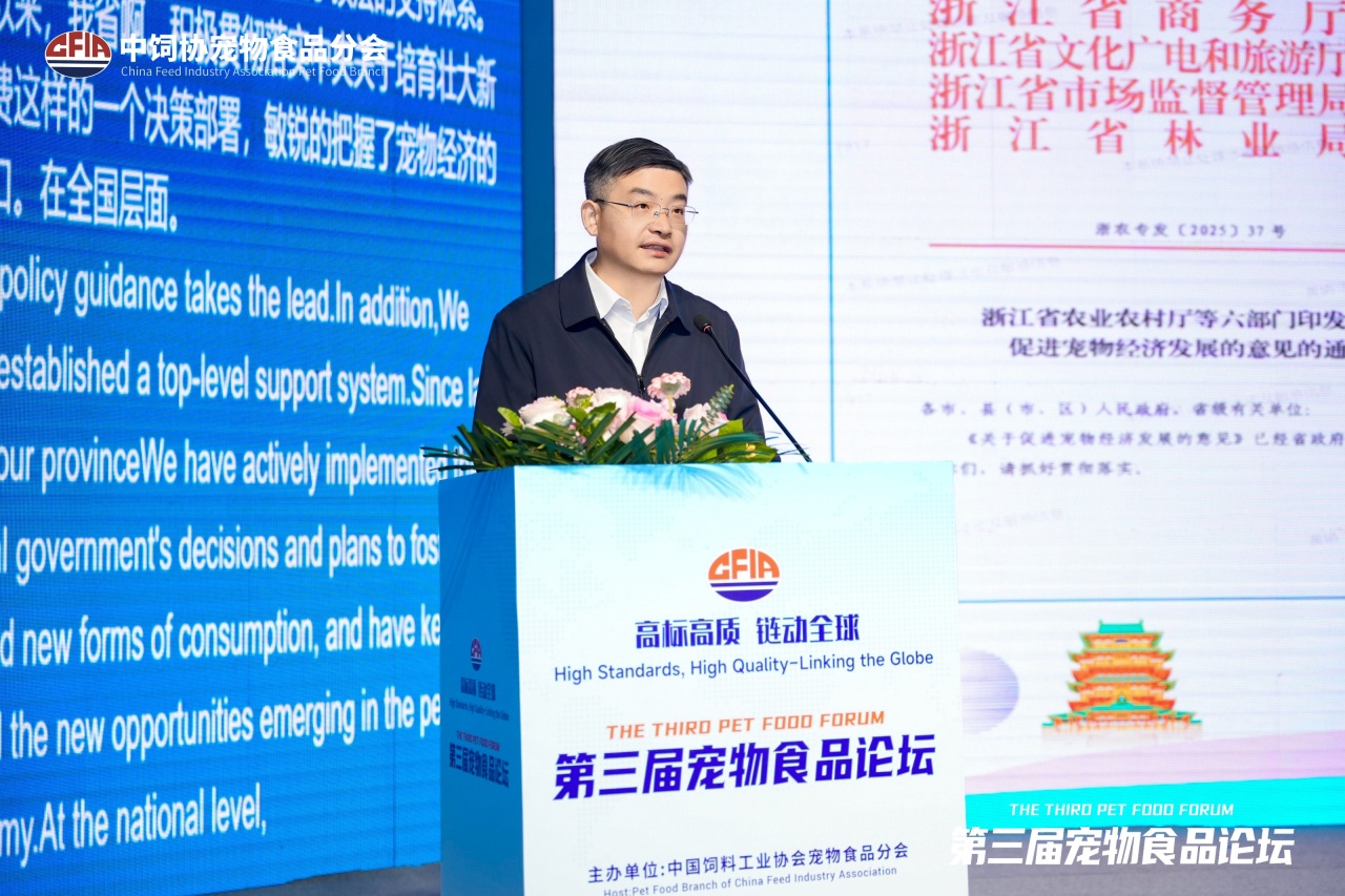 浙江省畜牧农机发展中心副主任韩彬翔带来《创新浙里,向欣向荣--浙江宠物食品品牌品质品类发展蝶变》主题演讲。他介绍,浙江已形成政策引领、全链配套、品牌集聚、智造升级的宠物食品产业格局,依托电商与外贸优势实现高质量发展。他表示,浙江将继续以创新、标准、品牌、双循环为抓手,打造全国宠物经济创新策源地与宠物食品品牌大省。