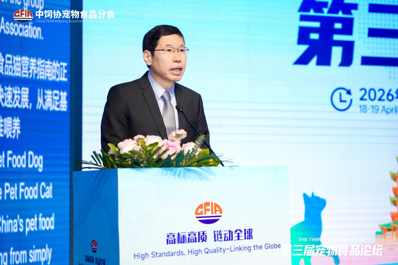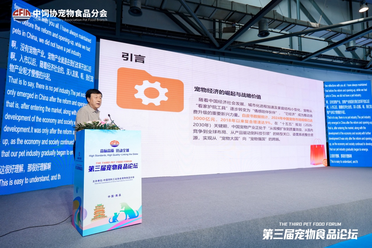 国务院参事、农业农村部原副部长于康震进行主旨报告。他强调当前宠物经济已成为满足人民美好生活向往的重要产业,行业正迈向高质量、规范化发展新阶段。本次论坛为行业搭建了权威交流平台,对推动宠物食品产业标准提升、科技创新与安全升级具有重要意义。