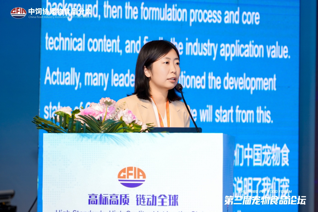 金华职业技术大学动物医学专业副教授、浙江大学新昌联合创新中心(天姥实验室)生物饲料团队宠物板块负责人许佳对中国饲料工业协会团体标准《全价宠物食品(犬、猫)营养指南》进行解读。她介绍了指南历时近三年编制、覆盖犬猫全生命周期全营养素的核心内容,该团标填补了国内现行标准短板、科学对接国际规范,她表示将助力企业精准配方、规范市场秩序,推动宠物食品行业迈向高质量精准营养时代。