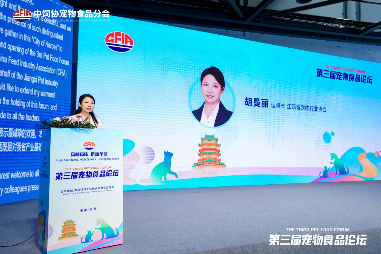 江西省宠物行业协会理事长胡曼丽进行大会致辞。她谈到本次论坛为行业搭建了高效交流平台,协会将以科技赋能与标准引领,推动江西宠物食品产业向更规范、更高质方向发展,共筑健康有序的产业生态。