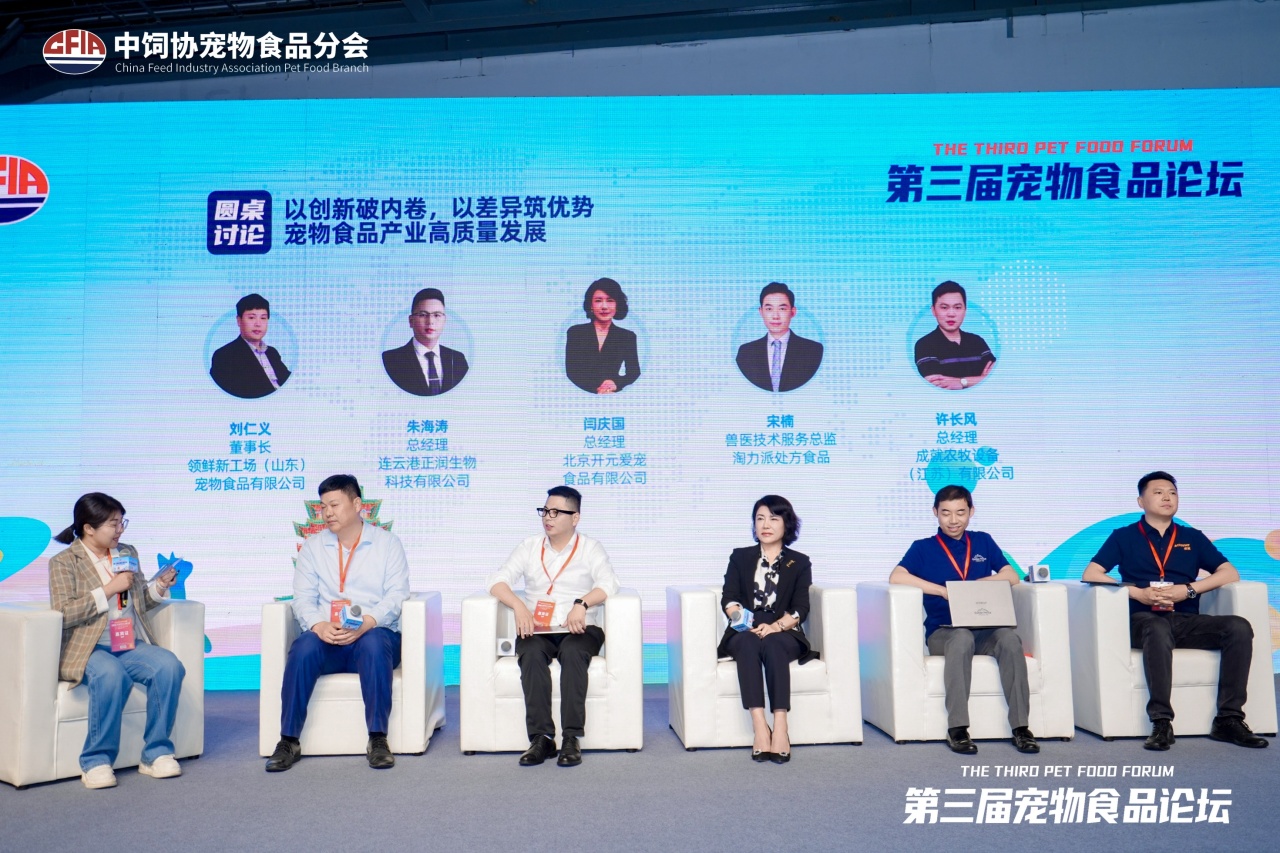 主题为“以创新破内卷,以差异筑优势——宠物食品产业高质量发展”的圆桌对话,由北京市兽药饲料检测中心高级畜牧师姚婷主持,领鲜新工场(山东)宠物食品有限公司董事长刘仁义、连云港正润生物科技有限公司总经理朱海涛、北京开元爱宠食品有限公司总经理闫庆国、淘力派处方食品兽医技术服务总监宋楠,以及成就农牧设备(江苏)有限公司总经理许长风共同参与。嘉宾们围绕企业差异化定位、技术创新、细分赛道深耕与设备升级展开讨论,探讨如何以产品差异与服务创新破解宠物食品行业内卷、实现从卖产品到经营客户关系的转型,推动宠物食品产业高质量发展。